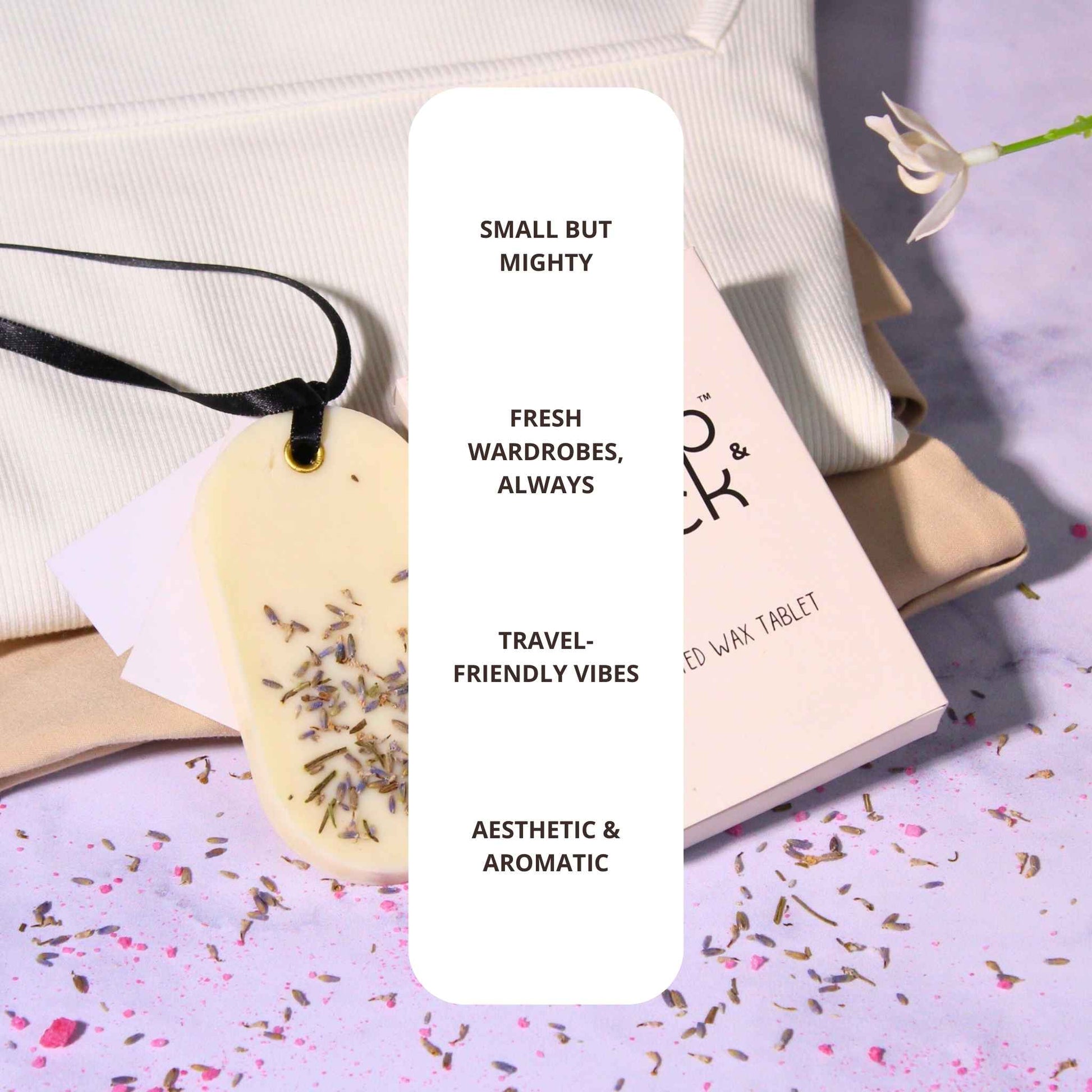 Hang or place the Wax Tablet in wardrobes, drawers, or near entryways for long-lasting fragrance. Avoid direct sunlight and heat. Once the scent fades, break and use it in a wax warmer to enjoy it as a room fragrance again.